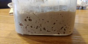 ביום השני הייתה תסיסה ממש חזקה, אך מאז נראה שהמחמצת לא מתפרעת יותר מידי. אני יכול להבחין בכיסי אוויר רבים וקצת בועות, אבל היא לא תופסת הרבה גובה.