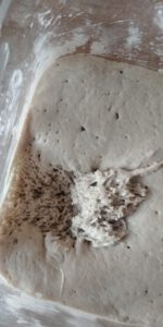 מוסיפים על המחמצת 100 גר מים, מערבבים ואז מוסיפים 100 גר קמח שיפון.